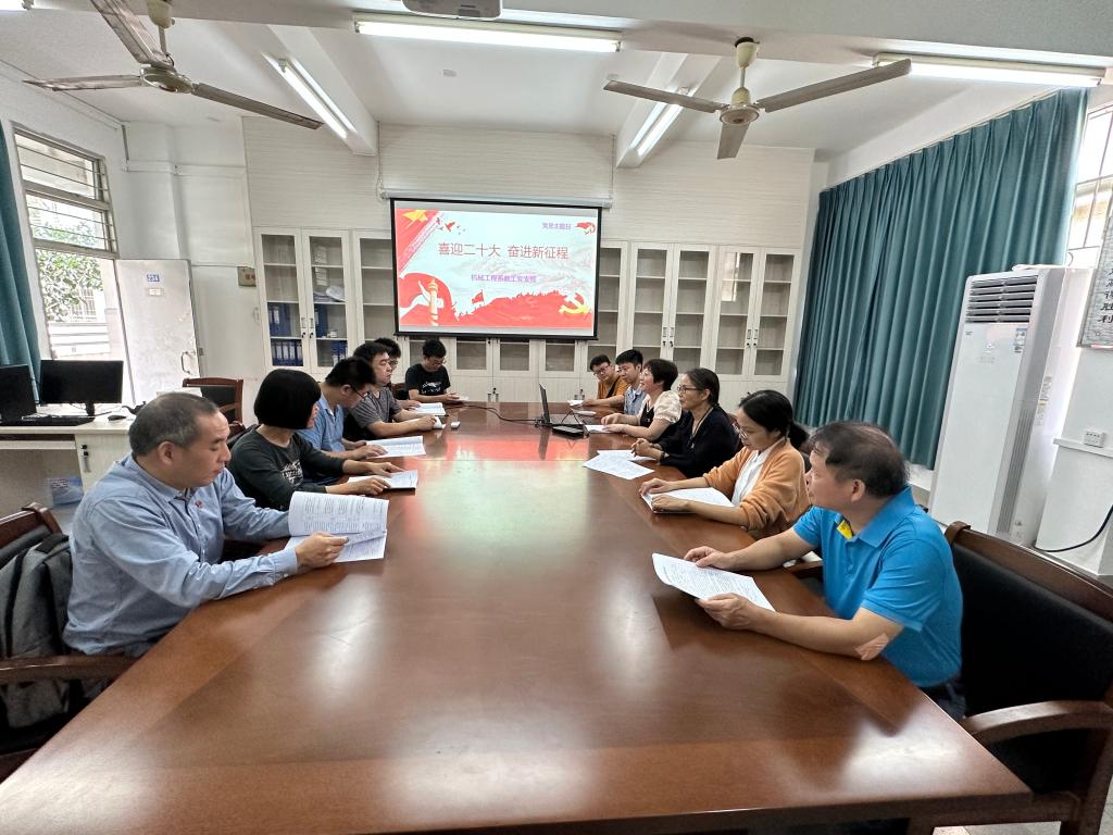 为激发全体党员的爱党爱国热情,增强党性修养,提升能力素质。10月29日下午,机械工程系教工党支部开展了“喜迎二十大 奋进新征程”主题党日活动。主题党日活动围绕学习党的二十大精神、课程教学大纲与课程思政、员工帮扶、校外员工生产实习活动环节等内容进行。
