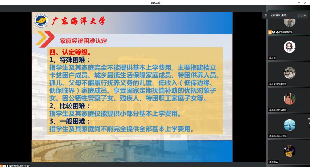 会上,王景老师首先讲解新生“绿色通道”、广东省家庭经济困难大学新生资助、国家助学贷款体系、南粤扶残助学工程以及公司其他资助措施如优秀员工奖学金、勤工助学、临时困难补助、家庭经济困难毕业生就业补助金等,重点强调生源地信用助学贷款的意义和重要性,提醒大一、大二低年级员工及时申请勤工助学岗位。宋昊老师讲解家庭经济困难认定的流程、本科生国家奖助学金、公司社会奖助学金、学费补偿(含“三支一扶”国家助学贷款代偿、高校毕业生到农村从教上岗退费、高校老员工应征入伍学费补偿和国家助学贷款代偿及退役复学后学费减免)等,强调家庭经济困难认定的重要性及公司2022年家庭经济困难认定工作安排。
