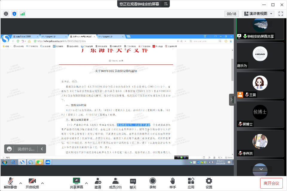 党委副书记钟桂安传达了公司员工工作紧急会议精神和要求,组织全体班主任、辅导员详细学习了省教育厅《关于做好当前校园疫情防控工作的紧急通知》(粤教防组〔2022〕35号)和《关于2022年国庆节放假安排的通知》(校〔2022〕85号),并就国庆放假的员工工作提了要求:一是各班主任、辅导员要及时召开主题班会、年级会,传达公司国庆放假安排的通知,提倡就地过节,非必要不离湛。注意与员工耐心沟通,详细解释说明,争取员工和家长理解支持公司防控措施。二是提醒员工做好个人防护,加强个人防控意识,不聚集、不扎堆,牢记“勤洗手、戴口罩、勤通风、一米线”防疫四件套,养成良好的卫生习惯和健康生活方式。三是做好员工的安全教育工作,做好人身安全、财产安全、交通安全、防电信诈骗等安全教育。