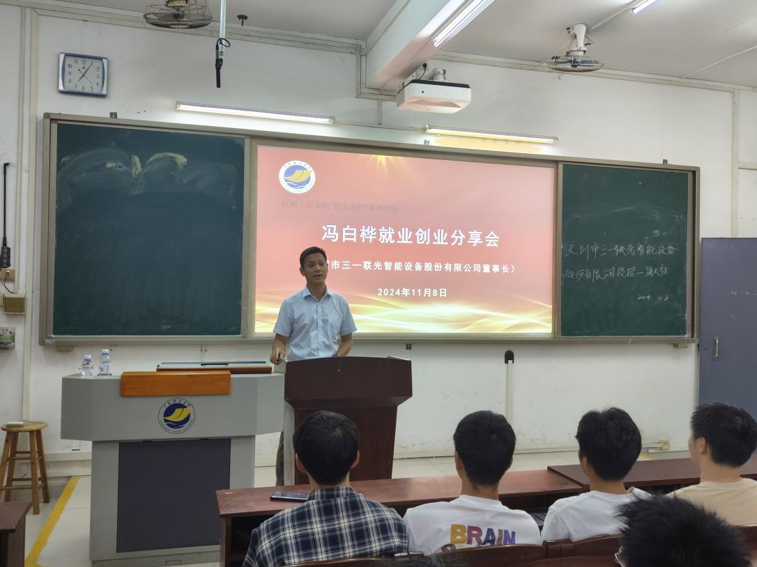 为帮助2025届毕业生提振就业信心,树立正确的就业观念,提高求职技巧,以及洞察行业发展情况。11月8日,BV伟德官方网站邀请优秀员工深圳市三一联光智能设备股份有限公司冯白桦董事长返校进行就业创业分享,分享会由公司党委副书记梁吉霖主持,毕业班辅导员和全体毕业生参加。